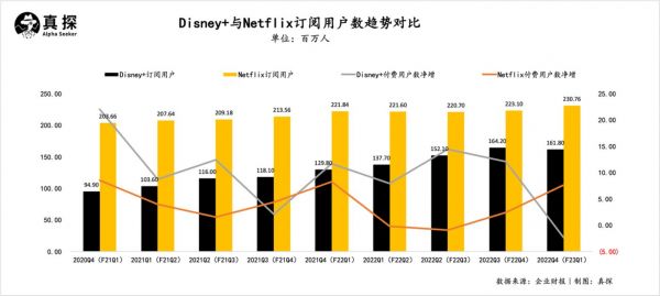 2023财年第一财季(即2022年第四季度),迪士尼营收235.1亿美元,同比增长8%,高于市场预期的233.7亿美元;实现整体经营利润30.43亿美元,同比上一财年下降7%,整体经营利润率12.94%;实现净利润13.61亿美元,净利润率5.79%;摊薄后每股收益为0.7美元,高于去年同期的0.63美元。截至报告期末,Disney+订阅数为1.618亿,相比上季度的1.642亿减少了240万,这也是Disney+上线以来首次出现订阅数下降的情况。财报电话会议上,管理层宣布了接下来迪士尼的新动态:计划裁员7000人,成本将缩减55亿美元(30亿美元的内容成本、25亿美元的非内容成本);继奈飞之后,迪士尼也不再提供订阅用户数预期指标,同时重申2024年流媒体盈利的目标。