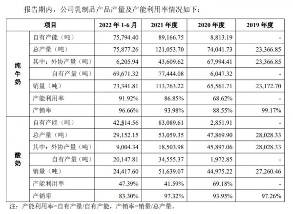 数据显示,2019年度,其纯牛奶和酸奶的自有产量皆为0;2020年度有所改善,但外协产量占比仍超9成。其中纯牛奶外协产量占总产量比重为91.83%,酸奶外协产量占比95.88%。
