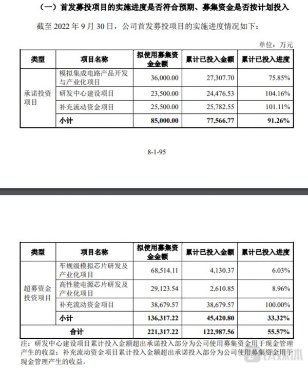 截至2022年9月,首发承诺募投项目实施进度为91.26%,首发超募募投项目的实施进度为33.32%。思瑞浦表示,上述项目均按照计划募集资金投入情况有序推进,不存在可能影响项目进展的重大不利情况。