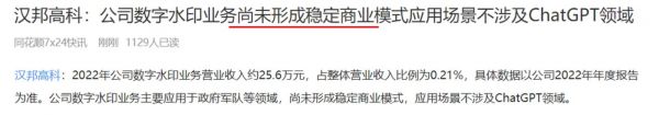上周末,汉邦高科也给自己泼了一把“冷水”。汉邦高科表示,2022年公司数字水印业务营业收入约25.6万元,占整体营业收入比例仅为0.21%,具体数据以公司2022年年度报告为准。公司数字水印业务主要应用于政府军队等领域,尚未形成稳定商业模式,应用场景不涉及ChatGPT领域。