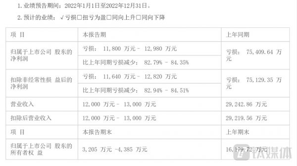 汉邦高科2022年年度业绩预告显示,公司净利润预计亏损1.18亿元~1.3亿元,比上年同期亏损减少82.79%~84.35%。公司给出的解释是业务开展不及预期,报告期内解决方案类业务相对保持稳定,音、视频产品及其他设备类硬盘销售收入较低,整体收入较上年同期下滑。