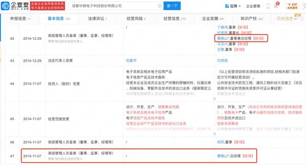 同样的,2014年11月7日,黄晓山新增进入成都华微董监高之列并担任总经理;2014年12月29日,黄晓山担任董事兼总经理;2021年9月18日,成都华微法定代表人从阳元江变更为黄晓山。