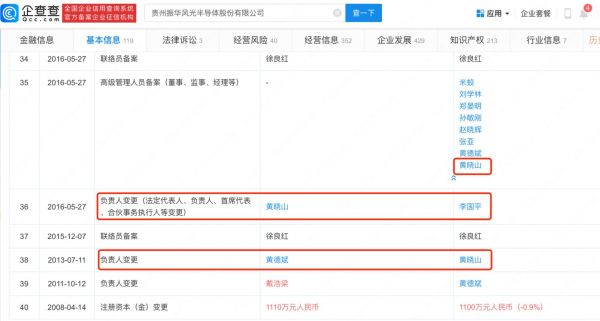 而根据企查查,2013年7月11日,振华风光的负责人由黄德斌变更为黄晓山;2016年5月27日,振华风光负责人由黄晓山变更为李国平,同时黄晓山进入振华风光的董监高之列,直到2021年6月29日退出。