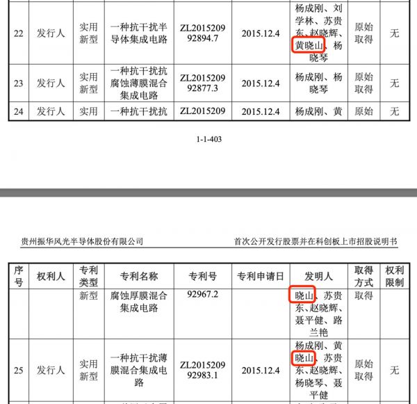 且根据振华风光的招股书,在其2015年12月4日申请的三个实用新型专利的发明人一栏,赫然出现黄晓山的名字。