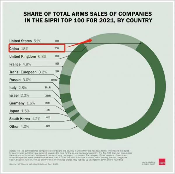 根据SIPRI发布的“2021年全球武器生产和军事服务公司百强榜单”,2021年全球军火销售总额达到了5920亿美元,其中美国占据了51%,中国为18%,排名第二。而在2016-2020年,中国武器出口额还只占世界武器出口总额的5.2%。