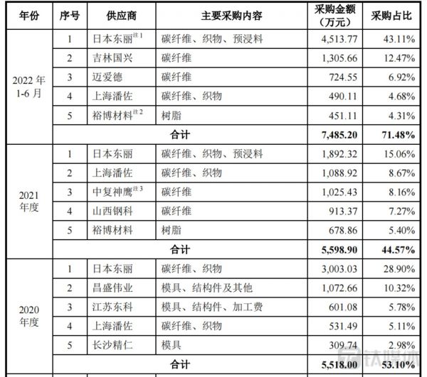 报告期内,晋飞碳纤向前五大供应商的采购金额分别占采购总额的67.65%、53.10%、44.57%、71.48%。虽然2021年占比下滑至四成,但2022年上半年迅速反弹。