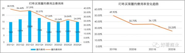 叮咚Q4的履约费用率为24.09%,较去年同期的32.57%下降了超8个百分点。整个2022年,叮咚的履约费用率控制在25.25%,创2019年以来最低水平。