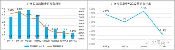 叮咚Q4的营销费用约9110万元,营销用率1.47%,较2021同期的6.5%大幅下降。2022全年,叮咚营销费用率仅为2.19%,同样为2019年以来最低值。
