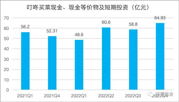 截至2022年Q4末,叮咚拥有现金、现金等价物和短期投资共计64.93亿元,扣除公司短期债务后净现金为 22.58亿元。环比2022年Q3(净现金16.13亿元),叮咚的资金压力得到大幅缓解。