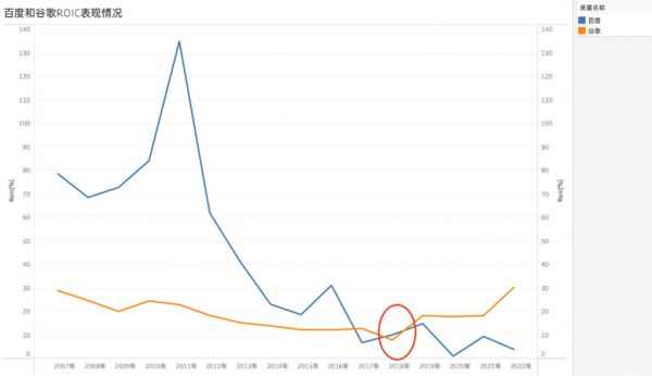 在找到第二曲线之后,谷歌之所以市盈率更为持久,很重要原因在于第二曲线并未过分透支企业的经营效率(虽下行,但较为平滑),百度则不同,由于原有搜索广告业务下行压力较大,与新业态的高投资膨胀辉映,拉低了企业整体的ROIC。