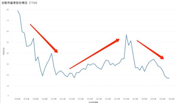 随着全球智能手机的大爆发,安卓系统的价值被凸显,极大提高了谷歌的增长潜力,市盈率随之上行,当智能手机趋近于饱和,此第二曲线的潜力被稀释,市盈率也就随之下行。