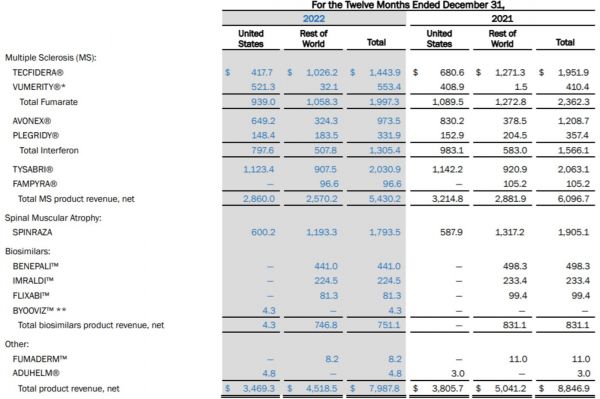 事实上,对比2021年,渤健去年旗下大部分产品的销售额都有所下降,但最终净利润取得大幅增长的原因,主要得益于出售三星Bioepis公司全部股权所得的10亿美元现金(总交易金额为23亿美元),以及出售建筑资产获得的 5.04 亿美元。