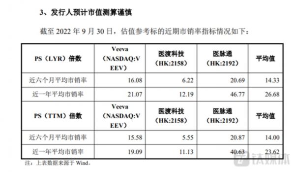 更加令人不可思议,太美科技的同行业可比公司为Veeva、医渡科技、医脉通,其PS倍数的具体情况如下: