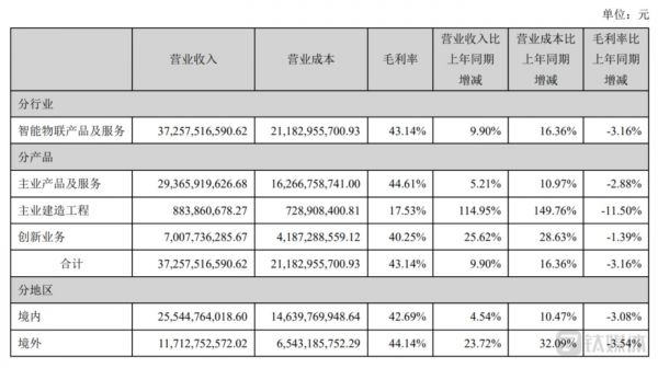 实际上,影响业绩表现的重要因素之一就是毛利率的下降。根据海康威视2022年中报数据显示,公司三大业务的毛利率均有不同程度地下滑。其中,主业产品及服务方面,营收实现293.66亿元,毛利率44.61%,同比减少2.88%;主业建造工程方面,营收为8.84亿元,毛利率为17.53%,同比减少11.50%;创新业务方面,营收实现70.08亿元,毛利率为40.25%,同比减少1.39%。