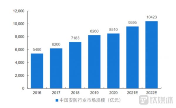 据中商情报网数据显示,2021年安防行业总产值9595亿元,预计2022年中国安防行业市场规模同比增长8.63%至10423亿元,其中安防工程、安防产品、运维和服务市场产值约分别占比60%、31%和9%。