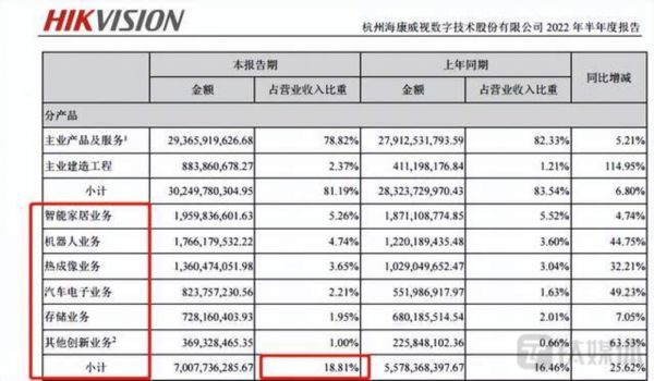 截至2022年上半年,海康威视的经营业务包括主业产品及服务、创新业务,分别占营收比重为78.82%、18.81%。