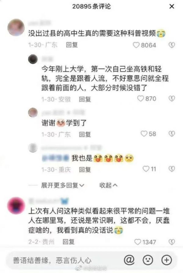 春节期间,小张在上网冲浪时刷到一条视频,视频的内容是主人公的自述:从小到大都在上学考试,没有机会跟朋友出去玩,至今没有坐过飞机,也没有坐过高铁。评论区中有不少暖心的鼓励的评价:大部分人都跟你一样,坐高铁也没有什么难的。