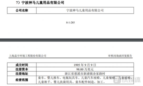 除此之外,在晶宇环境供应商票据找零的出票方还有一家宁波神马儿童用品有限公司,其主营业务为童车、婴儿推车、电瓶玩具车、儿童汽车座椅、儿童餐椅、儿童摇椅、 儿童秋千、婴儿洗澡用具、童车配件制造、加工。