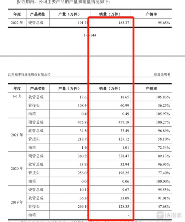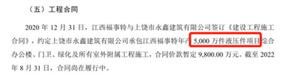 值得一提的是,福事特液压产品主要由硬管总成、软管总成、管接头、邮箱等构成。同时,报告期内,上述4种产品合计产生的销量分别为171.11万件、569.72万件、638.81万件、263.5万件。那么,为何福事特目前液压相关产品的销量最多不超过650万件的情况下,其却要扩建一个年产5000万件液压件项目的场地?