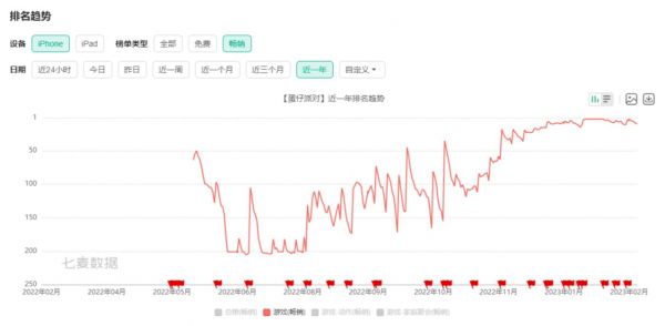 根据七麦的数据显示,目前《蛋仔派对》已经连续2个月位居畅销榜前10,在春节期间更是稳定排在第3位。