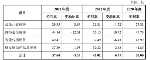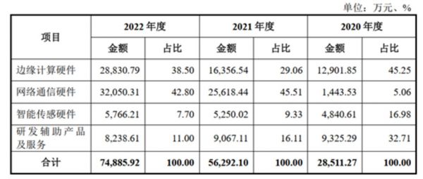 三大硬件占总营收8成。从收入结构来看,2020年-2022年,边缘计算硬件收入分别为1.29亿元、1.64亿元、2.88亿元,分别占当期总收入的45.25%、29.06%、38.50%;网络通信硬件收入分别为1443.53万元、2.56亿元、3.21亿元,分别占当期总收入的5.06%、45.51%、42.80%;智能传感硬件收入分别为4840.61万元、5250.02万元、5766.21万元,分别占当期总收入的16.98%、9.33%、7.70%。