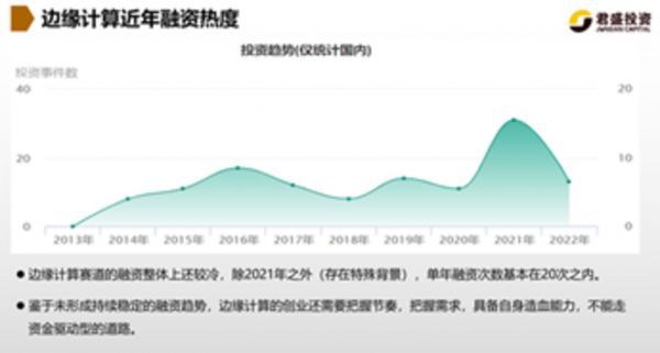 VC/PE对此也兴致缺缺。君盛投资执行事务合伙人李昊在2022年8月发表的主题为《边缘计算与VC投资》的演讲中提到,边缘计算赛道投资仍处于早期阶段,目前还是比较冷的,单年融资次数基本上是20次以内,由于2021年PE在这一赛道投资较猛,出手次数30次左右。