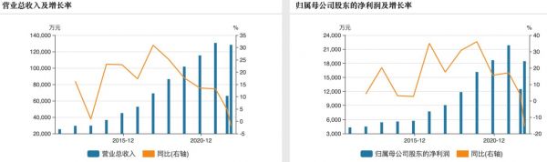 2015年,公司营收4.50亿元、归母净利润5722.27万元。此后,公司业绩常年保持两位数增长,到2021年,营收达到13.06亿元,6年时间翻了近3倍;归母净利润则到了2.19亿元,翻了3.82倍。但到了2022年,业绩却突遭下滑。