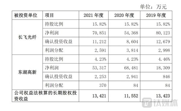 钛媒体APP发现,长江通信在2019年-2020年连续两年净利润下滑,公司称下滑原因是投资收益减少所致。可见,不管公司净利润增加与否,皆因投资收益所致。再细致一点研究长江通信关于2021年年报对上交所回函可以看出,虽然这两家公司每年都能给长江通信共带来1亿多收益,但其实收益的80%以上来自长飞光纤,而东湖高新只占不到20%。