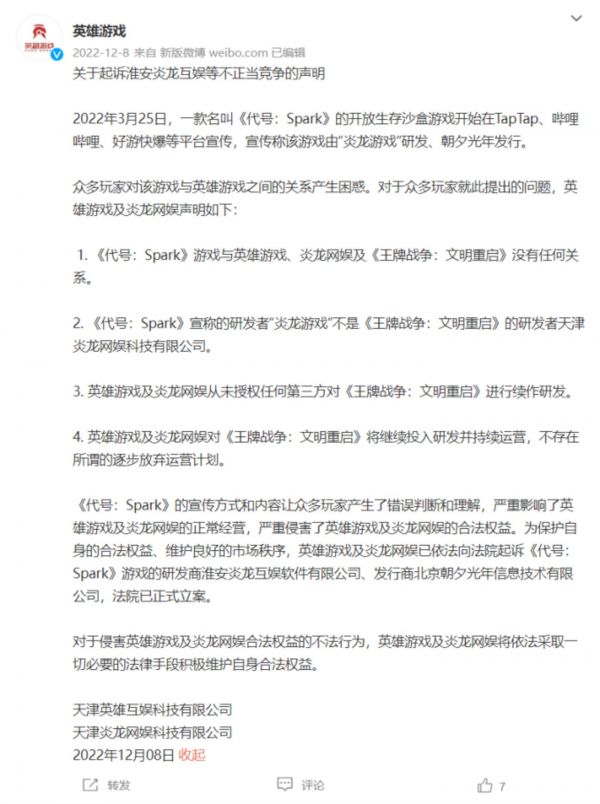 去年朝夕光年发行的开放生存沙盒游戏《代号:SPARK》,官宣开发商炎龙游戏,还被英雄互娱指责蹭热度。