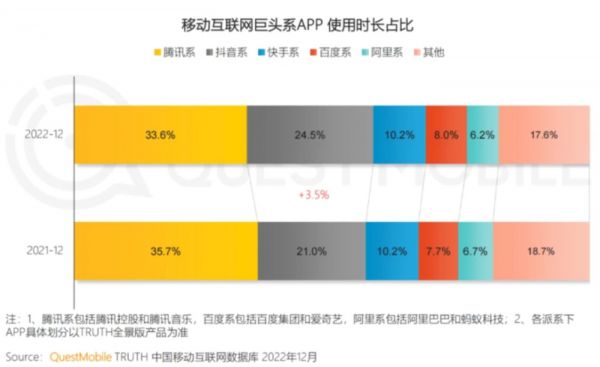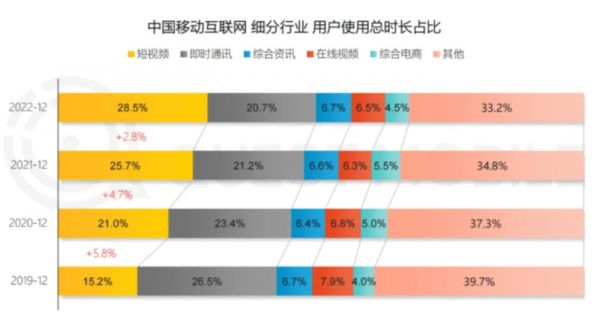 近日,QuestMobile发布《2022中国移动互联网年度报告》,其中最受关注的莫过于各个平台之间用户时长的此消彼长。报告显示,短视频已经成为用户时长占比最高的应用,由25.7%提升至28.5%,即时通讯则进一步由21.2%下滑至20.7%。腾讯系的用户时长占比由35.7%减少至33.6%,而抖音系的占比则从21.0%增长至24.5%。