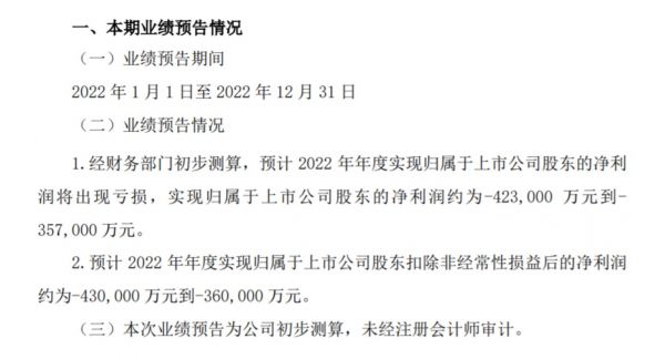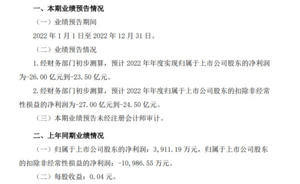 公告显示,预计2022年度实现归属于上市公司股东的净利润为-26亿元到-23.5亿元。上年同期归属于上市公司股东的净利润为3911.19万元,归属于上市公司股东的扣除非经常性损益的净利润为亏损约1.1亿元;每股收益为0.04元。