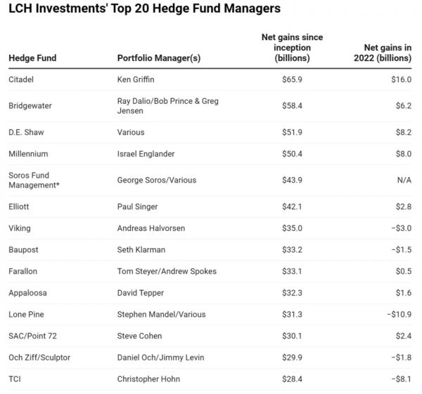 做空欧债的收益没能撑过2022年最后一个季度的跌宕,涨幅从超过13%收窄至4%,雪上加霜的是,LCH Investments 在1月发布的全球前20名对冲基金年度排名,城堡投资(Citadel)全方面力压桥水一头。