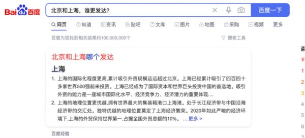 其实现在的百度搜索也在渐进地进化,生成式搜索早已初阶实现并应用。百度的搜索结果页很早之前就已经实现了简单的搜索信息整合,比如在经典的“北京和上海,谁更发达?”的这类经典问题下,搜索引擎会根据搜索结果进行直接的数据对比,甚至是计算,给出直接的答案。