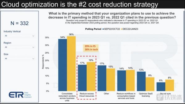 根据ETR最新调研数据能够清晰地看到,客户优化云成本存在几种策略:一是整合跨部门/组织的冗余供应商;二是降低过度云资源使用;三是降低以消费为主导的服务和工具支撑的工作负载;四是优化SaaS订阅模式等等。