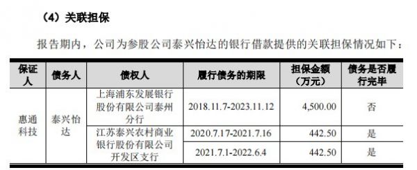 值得注意的是,惠通科技还曾为泰兴怡达的银行借款提供关联担保。泰兴怡达因建设投资需要,分别向浦发银行泰州分行、泰兴农商行开发区支行分别借款3亿元、2950万元。惠通科技与怡达股份系按照出资比例各自为相关贷款提供连带责任保证担保,惠通科技担保金额分别为4500万元、885万元。