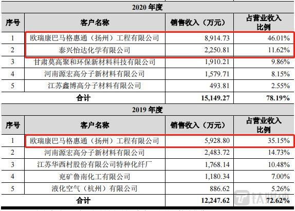 惹人注意的是,上榜前五大客户的OBHE与泰兴怡达是惠通科技“自己人”,2020年曾“携手”贡献超五成营收。OBHE由外资股东欧瑞康与惠通科技合资设立,欧瑞康控股60%,惠通科技参股40%,主要对外承接聚酯工程业务,惠通科技为其提供聚酯设备的制造。