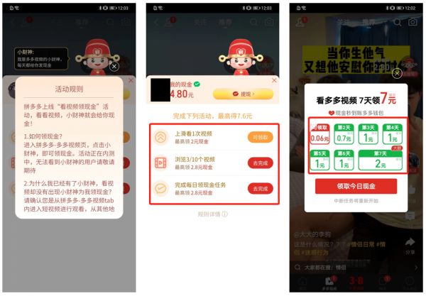 首先,慷慨的补贴是吸引用户关注的第一法则。得益于拼多多以下沉市场为主、覆盖年轻人和中老年群体的用户画像,看视频赚钱这种简单粗暴的玩法,对时间相对宽裕的小镇消费者很有吸引力。