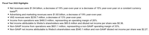 2023年3月1日,微博公布了2022年Q4及全年财报。2022年营收18.4亿美元,剔除汇率因素同比下跌15%;2022年Q2以来,微博坚持降本增效策略,提升了运营效率,全年调整后营业利润为6.011亿美元,超市场预期。