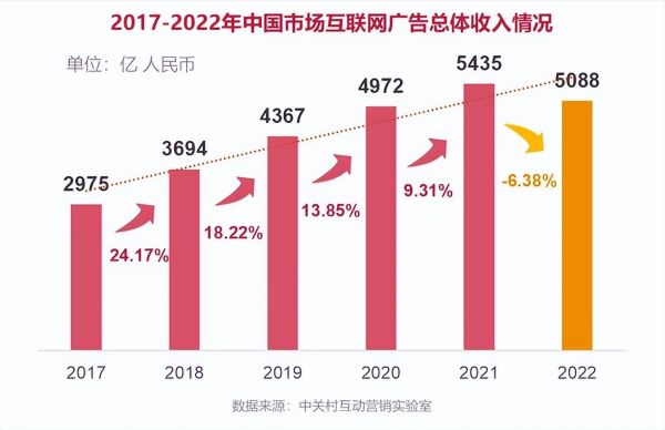 结合市场环境来看,在疫情的影响下,消费者消费热情降温,广告主的投放愈加保守。中关村互动营销实验室披露的《2022中国互联网广告数据报告》显示,2022年,中国互联网广告市场规模为5088亿元,同比下跌6.38%,是近七年首次出现负增长。