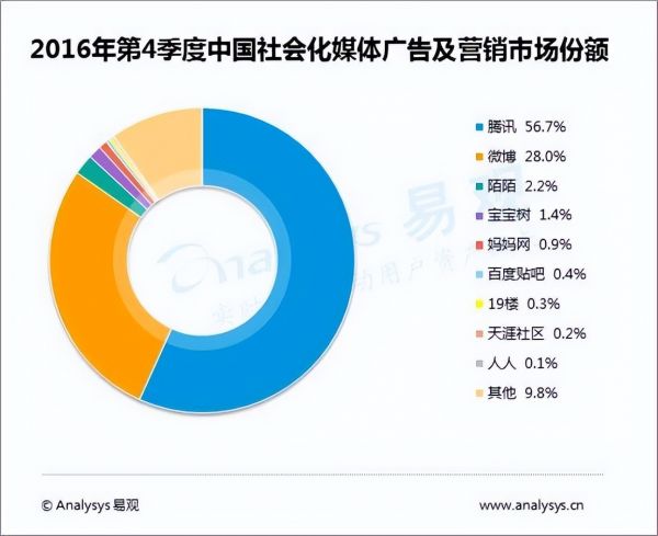 对比来看,易观数据显示,短视频兴起前的2016年Q4,中国社会化媒体广告及营销市场份额榜单中,微博占比高达28%,位居第二。
