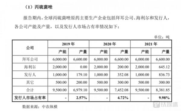 也就是说,2019年至2021年,拜耳公司的丙硫菌唑原药产量均为6600吨,且市场占有率至少为78.74%。而若久易股份上述募投项目建设完成后,公司将新增5000吨/年的丙硫菌唑原药生产能力,久易股份突然新增如此多的产能是否能被市场消化?与此同时,若募投项目建设完成后,久易股份势必要面临与拜耳公司抢占市场的情况,那久易股份如何能从拜耳公司手中抢到市场?