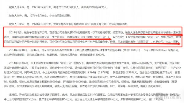 在该案件中,许全民以百分百公司的名义与王友定(彼时为久易股份市场运营部经理)商定,借用久易股份吡蚜酮的农药登记证、生产许可证、质量标准证(以下简称“农药三证”)。双方约定:王友定提供吡蚜酮“农药三证”及电子标签,并对百分百公司设计的产品外包装进行审定,百分百公司按久易公司的标准生产并对产品质量负责。经查,王友定擅自出借“农药三证”,久易公司并未从中营利。为何作为市场运营部经理的王友定可以拿到久易股份的农药三证?有关上述问题,钛媒体 APP 发函至公司,但截至截稿,没有收到公司的回复。(本文首发于钛媒体 APP,作者|邓皓天)