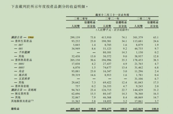 据了解,澜沧古茶除了经典产品线“1966”,澜沧古茶还推出时尚产品线“茶妈妈”,并在2022年7月推出新产品线“岩冷”。从目前产品收入结构来看,“1966”产品线依旧是澜沧古茶的拳头产品,该产品线收入从2020年的2.99亿元增至2021年的4.14亿元,分别占同年总收入的73.8%、74.1%。不过,2022年收入下滑至3.01亿元,收入占比降至65.1%。