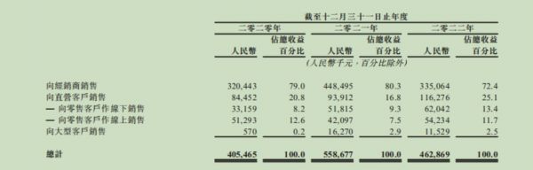通过研究招股书发现,经销商对澜沧古茶的业务也是至关重要的。2020年-2022年,来自经销商的收益分别占澜沧古茶总收益的79%、80.3%及72.4%,对应的销售收入分别为3.2亿元、4.48亿元、3.35亿元。
