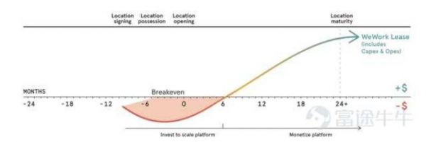 根据Wework招股书,其新项目从启动、开业到达到盈亏平衡点需要超过一年半的时间,而截至2019年6月1日,Wework只有30%的物业达到成熟(实现盈亏平衡),70% 的项目仍在培育期,需要额外投入现金流。与此同时,扩张仍在继续,资金缺口仍在不断扩大。