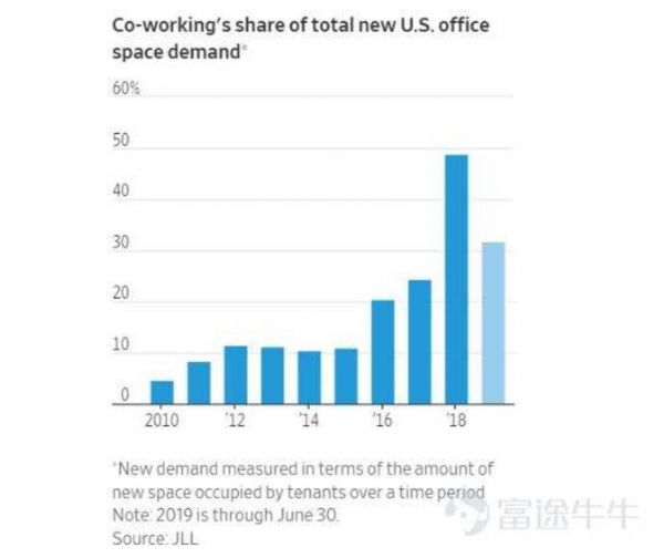 根据WSJ的报道,企业愿意为此便利支付更高的租金。一位美国房地产主管表示,传统房东50美元每平方英尺的空间,Wework等共享空间则可以收取110美元/平方英尺,租户愿意承担这部分溢价。