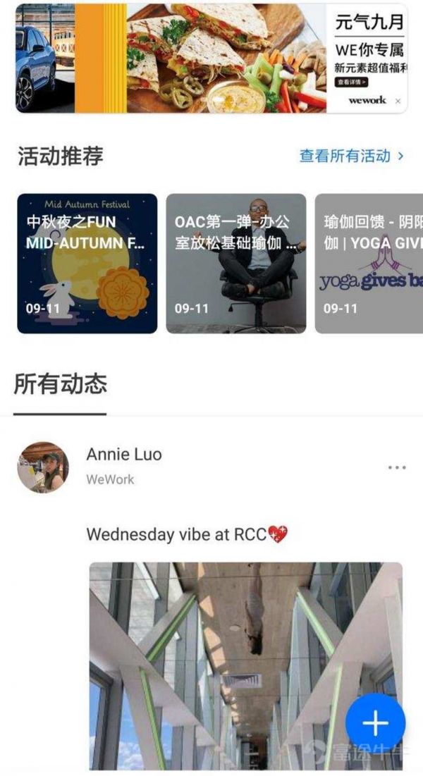 除此以外,Wework的APP中还有一个专门的社区模块,主打办公楼社交。然而,办公室社交就好像和同事的关系一样微妙,太专业会尴尬,太生活也会尴尬。目前来看,Wework的这个板块也较为鸡肋,更多是沦为各公司福利的外宣渠道以及办公楼瑜伽健身等的组织平台。当然也免不了所有社区都会有的——信息流广告。