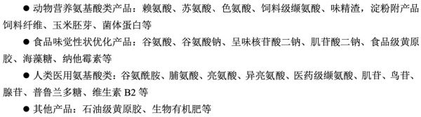 实际上,动物营养氨基酸类产品就包括了赖氨酸、苏氨酸、饲料级缬氨酸等产品,均为饲料添加剂;食品味觉性状优化产品则包括谷氨酸、谷氨酸钠(味精的主要成分)等;人类医用氨基酸类则包括了谷氨酰胺、肌苷等。