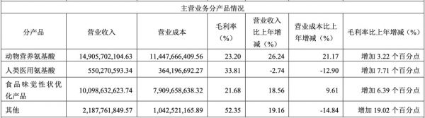 分产品来看,2022年动物营养氨基酸贡献收入149.06亿元,同比增长26.24%;食品味觉性状优化产品贡献收入100.99亿元,同比增长18.56%;其他产品贡献收入21.88亿元,同比增长19.16%;人类医用氨基酸贡献收入5.50亿元,同比减少2.74%。毛利率则分别为23.20%、21.68%、52.35%、33.81%,同比均录得增长。