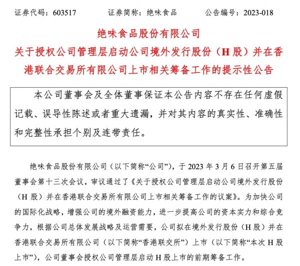 3月6日晚间,绝味食品披露公告称,公司第五届董事会第十三次审议通过了《关于授权公司管理层启动公司境外发行股份(H股)并在香港联合交易所有限公司上市相关筹备工作的议案》,公司拟在境外发行股份(H股)并在香港联合交易所有限公司上市,公司董事会授权公司管理层启动H股上市的前期筹备工作。